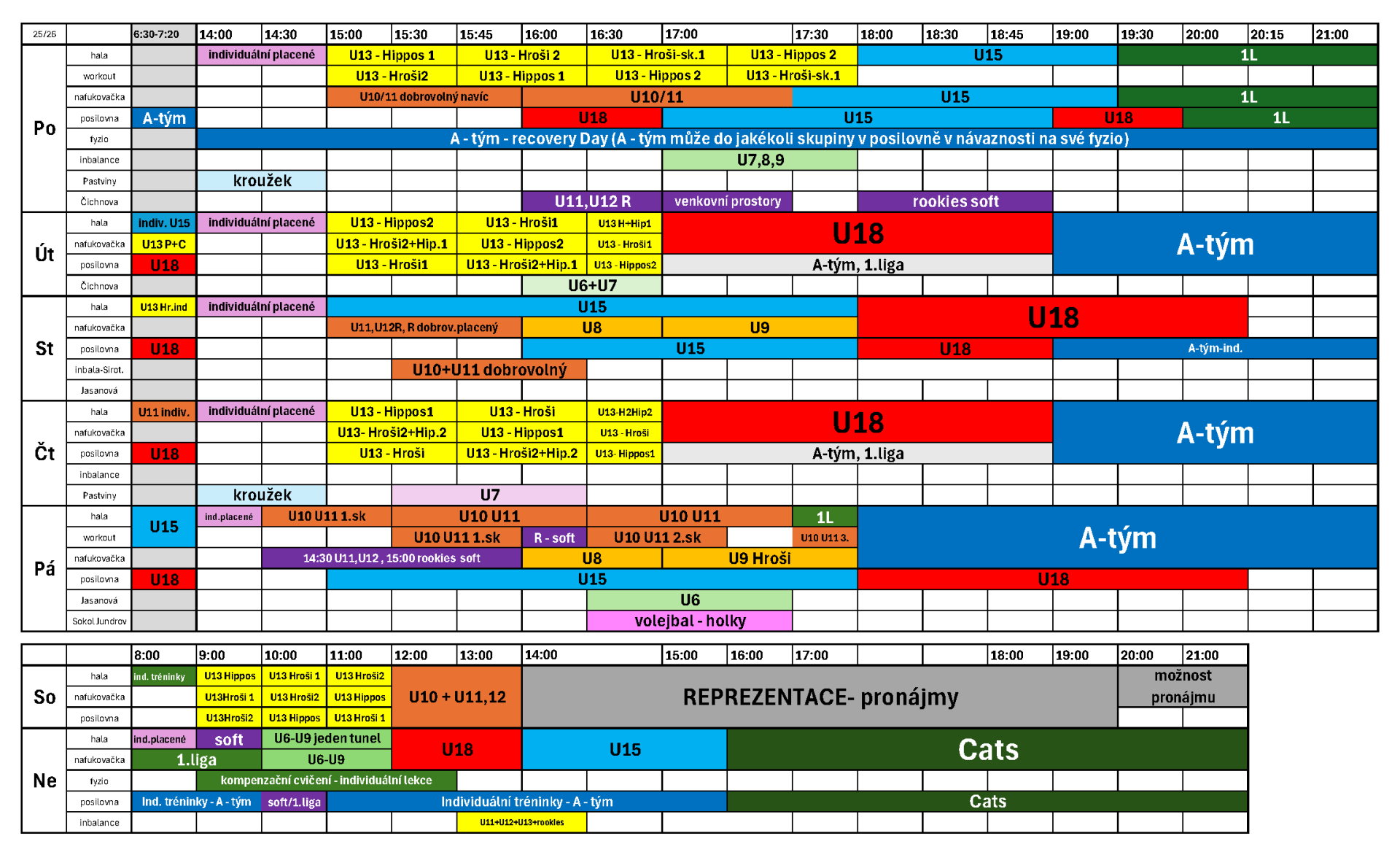 Hroši Brno absolvují pravidelně 2–6× tréninkových jednotek týdně, pod vedením minimálně dvou licencovaných trenérů. Kromě týmových tréninků mají hráči možnost individuální přípravy. V období duben–září se o víkendech účastní soutěžních zápasů v rámci regionálních lig. Program se liší podle věkové kategorie, více informací najdete níže.