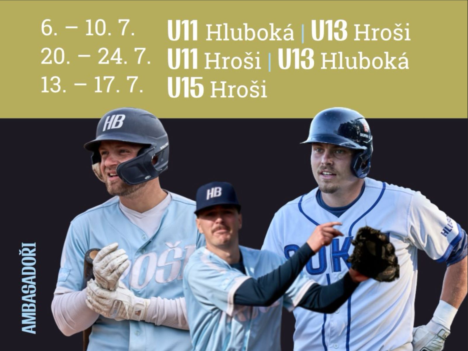 Letní sportovní kemp s baseballovým turnajem a přespáním ve stanech pro kategorie U11, U13 a U15. Týden plný baseballu, her, letní atmosféry a týmových zážitků ve sportovních areálech Hroši Brno a Hluboká nad Vltavou. Každý tým odehraje 5 zápasů, děti čeká pestrý sportovní program a finálový turnaj.